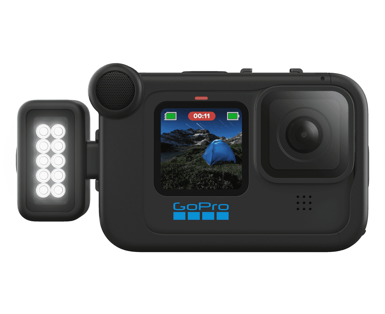 Leve luzes de LED compactas e potentes à sua próxima aventura. Com o Módulo de iluminação, você pode capturar fotos e vídeos com muito mais nitidez, iluminando sua atividade com luzes amplas, estáveis e uniformes. O Módulo de iluminação pode ser conectado à HERO11 Black e à HERO10 Black por meio do Módulo de mídia (vendido separadamente) ou usado como uma fonte de luz independente em suportes da GoPro.